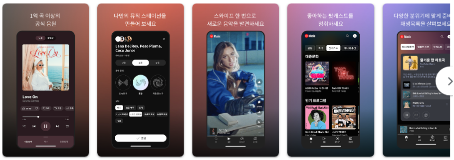 YouTube Music은 전 세계 음악과 뮤직비디오를 아우르는 종합 음악 플랫폼입니다. 라이브 공연, 커버곡, 리믹스 등 기존 음원 서비스에서 찾기 어려운 다양한 콘텐츠를 제공합니다.