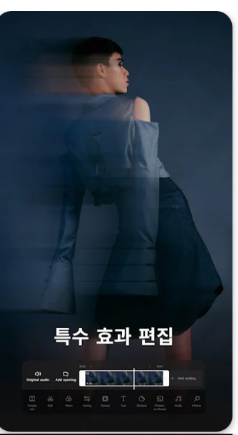 • 텍스트, 스티커, 필터, 전환 효과 등 다양한 편집 요소 제공