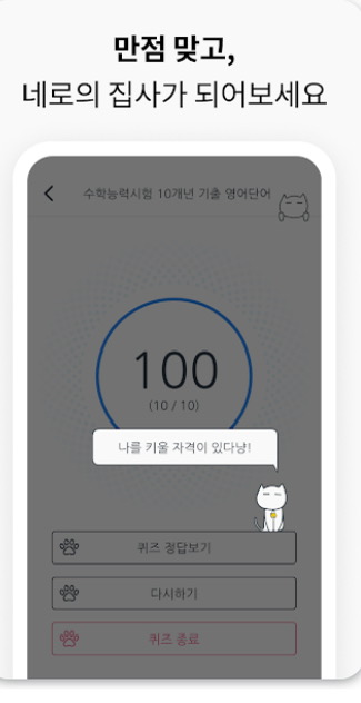 • 캐릭터 학습 동기 부여: 귀여운 고양이 캐릭터 ‘네로’가 학습 상황에 반응하며 지속적인 학습 동기를 제공합니다.