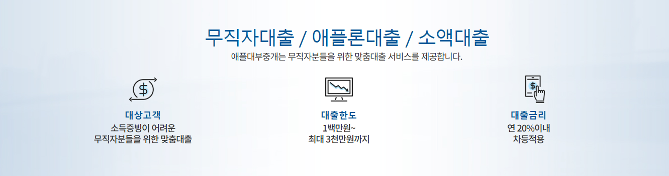 애플론중개대부는 무직자분들을 위한 소액대출 서비스를 제공하며, 대출 한도는 최소 100만 원에서 최대 3천만 원까지 가능합니다.
