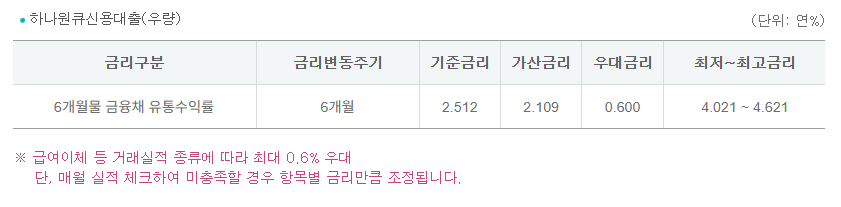 - 금리는 6개월물 금융채 유통수익률(기준금리)과 가산금리, 우대금리를 합산하여 산정